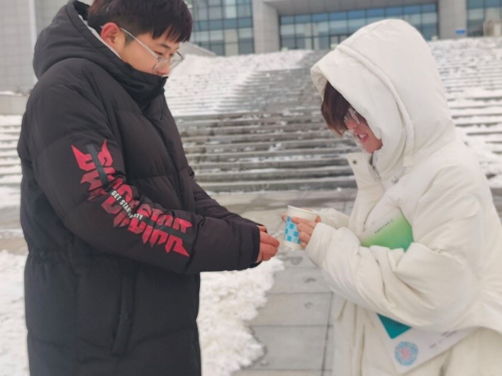 在这个初雪来临的寒冬,为增进与校工作人员的情感交流,表达本校学生对辛勤工作的老师、保安、食堂等工作人员的感谢,眼视光工程学院青年志愿者协会于2023年12月15日开展“清茶之温,暖心之本”的冬日暖茶活动。
