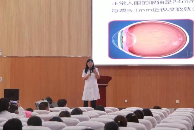 讲解如何早期发现及预防,突出了在用眼过程中放松是极为重要的一个环节,现场带领大家进行眼部放松互动。并表示希望在场的老师们,将对青少年正确用眼的科普及提示贯穿在日常学习课堂中,共同为青少年近视防控贡献一份力量,呼吁学校为青少年建立眼健康档案,定期关注青少眼健康状态。