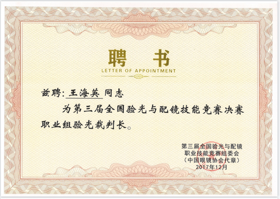3-10王海英老师受聘任第三届全国验光与配镜技能竞赛职业组验光裁判长
